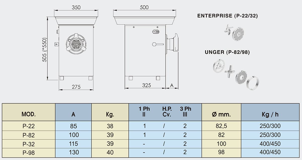 | Motor | Monofásico 230 V. II (2.5 CV), Trifásico 400 V. III (2 CV), Trifásico 400 V. III (3 CV) |