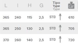 | Medidas | 250x130x2,5 mm, 260x140x2,5 mm, 240x115x2,5 mm |