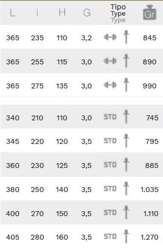 | Medidas | 250x230x3,5 mm, 245x190x4,5 mm, 230x165x3,37 mm, 225x210x3,5 mm, 210x180x3,5 mm, 215x190x3,5 mm, 240x170x4,5 mm, 270x215x4 mm, 220x200x3,5 mm, 220x170x4,5 mm, 195x160x4,5 mm, 240x220x4 mm, 255x185x3,37 mm |