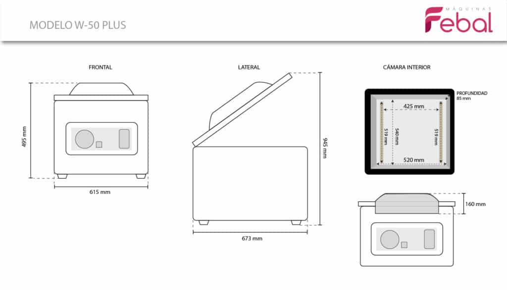 Máquina: 673×615 mm – Altura: 495 mm (945 mm aberta)