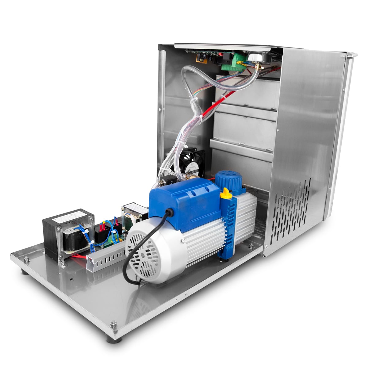 – Placa de fibra com pés para o interior da câmara – Pano de fibra para a substituição da barra de vedação – Resistência para a barra de vedação – Junta de silicone para a tampa – Óleo para encher a bomba de vácuo