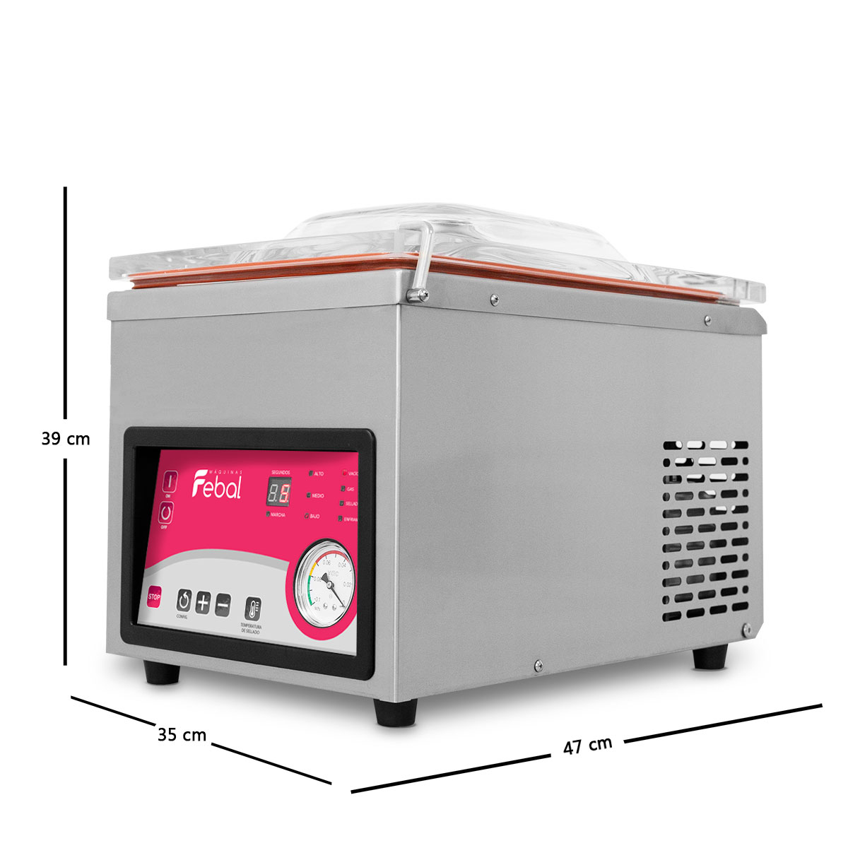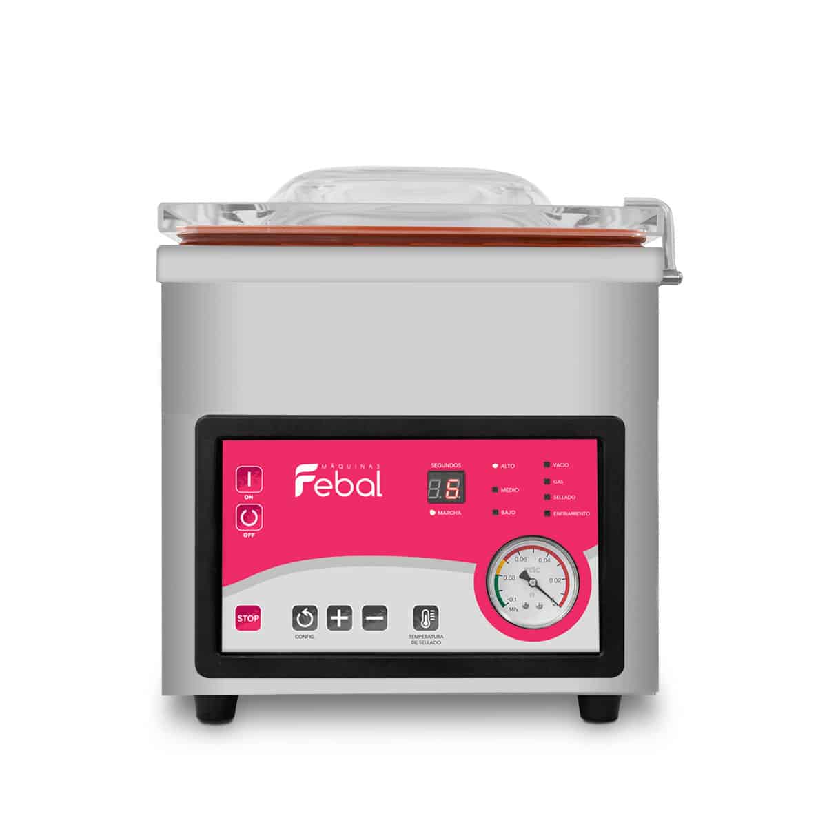 – Temporizador eletrónico que controla as operações de vácuo e de selagem do saco de acordo com o tempo pré-definido.