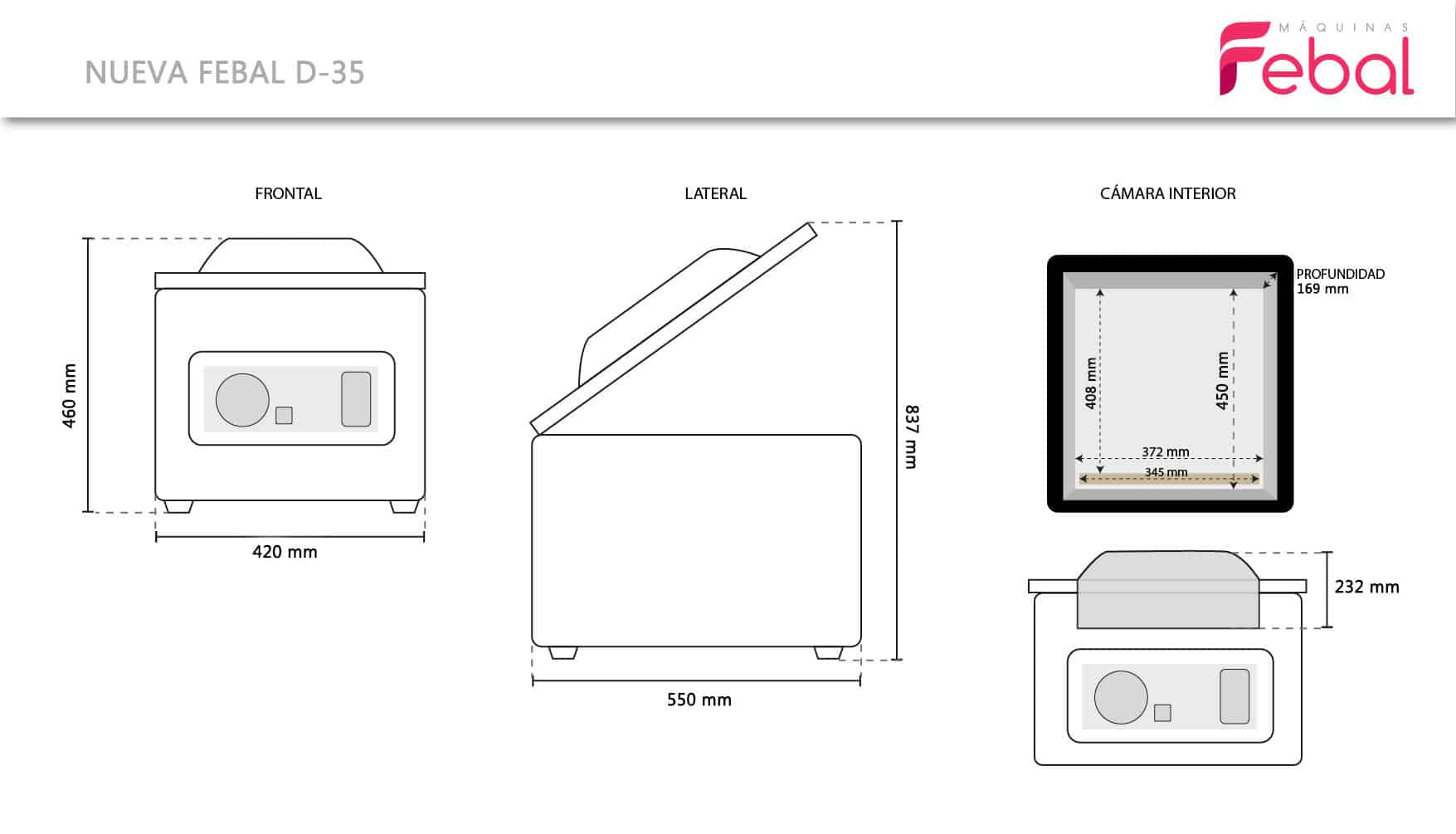 NOVO MODELO D-35. Embala sacos até 33 cm de largura x 50 cm de comprimento. Todos INOX. Digital. Permite o ensacamento a vácuo a partir do exterior da câmara.