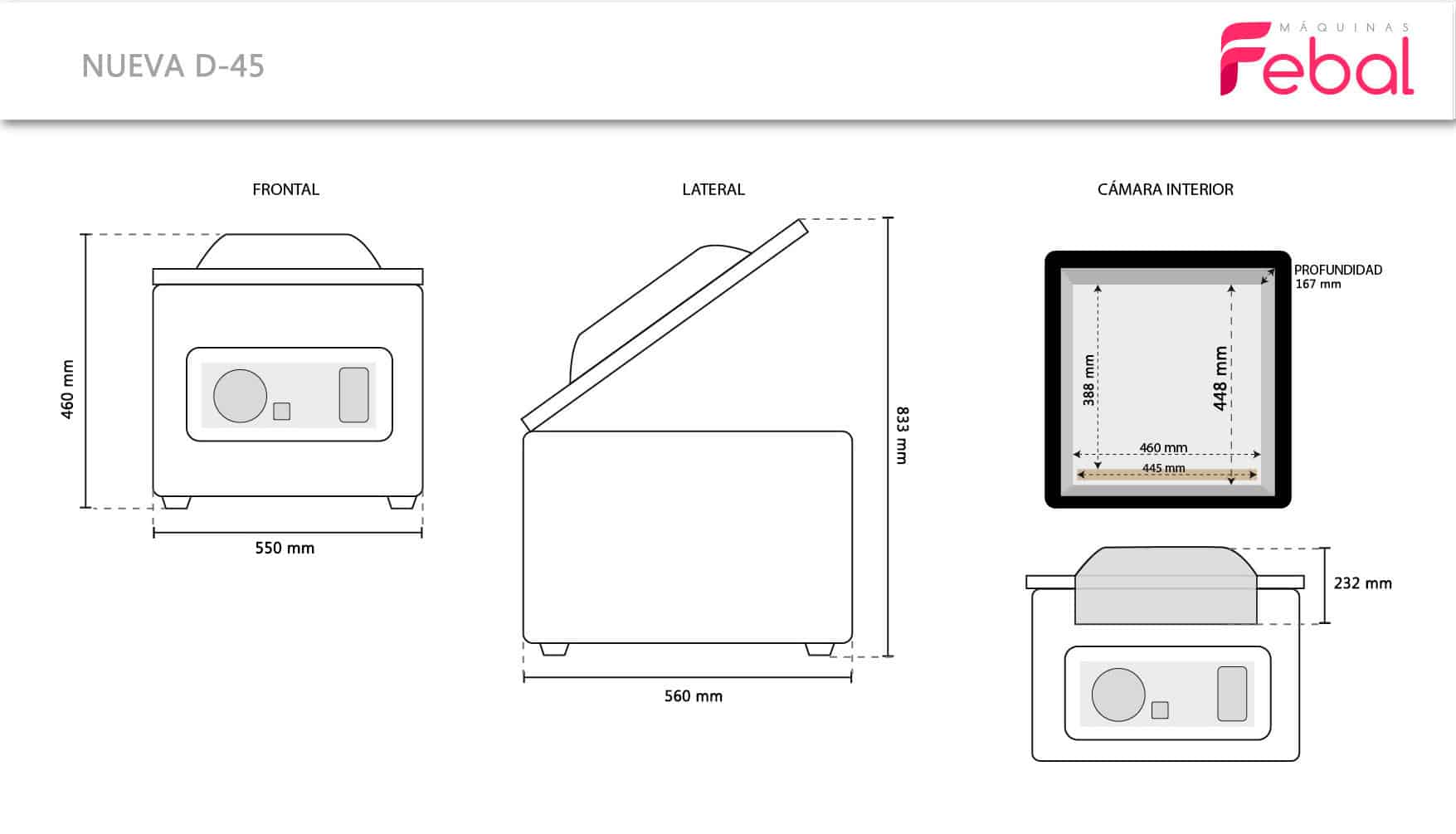 Máquina: 550×560 mm – Altura: 460 mm (833 mm aberta)