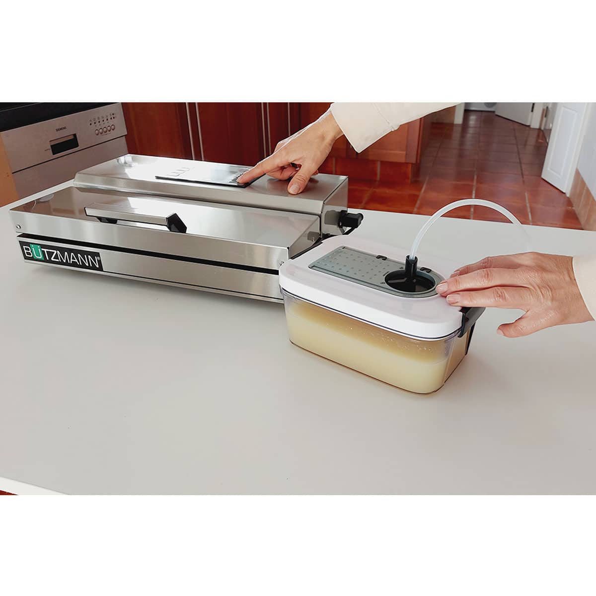 Compatível com a máquina de embalar sem câmara Bützmann EX-31 quando utilizada em conjunto com a cânula de vácuo.