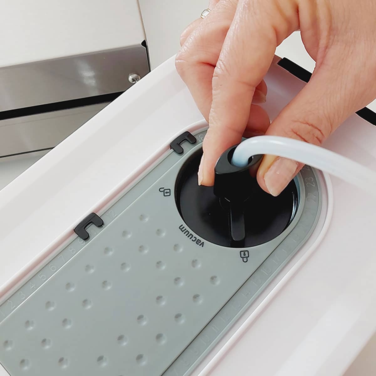 Graças à sua válvula regulável, pode ser utilizado em qualquer máquina de embalar a vácuo COM SINO, inserindo-o no interior da câmara.