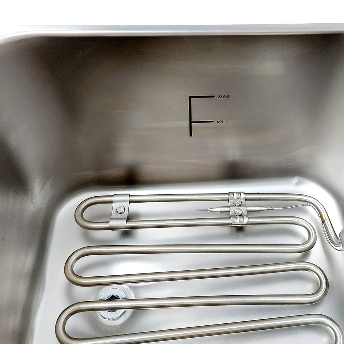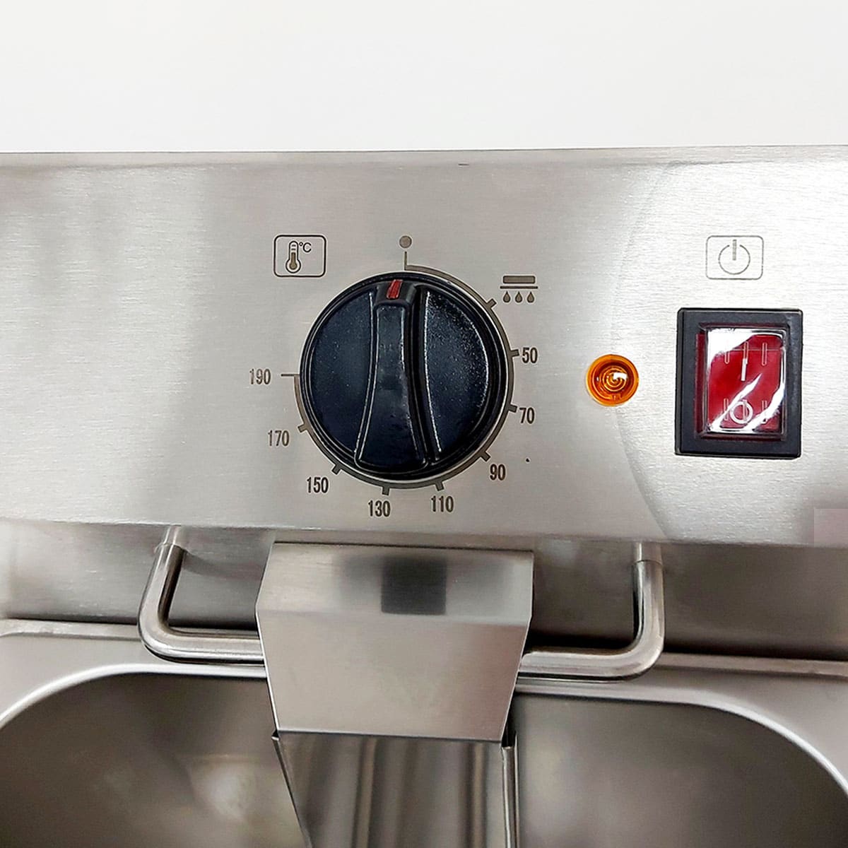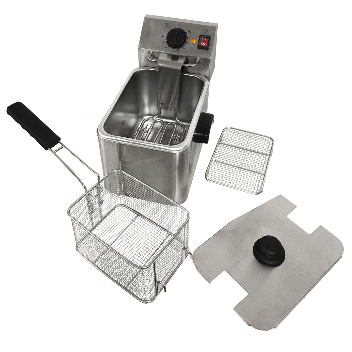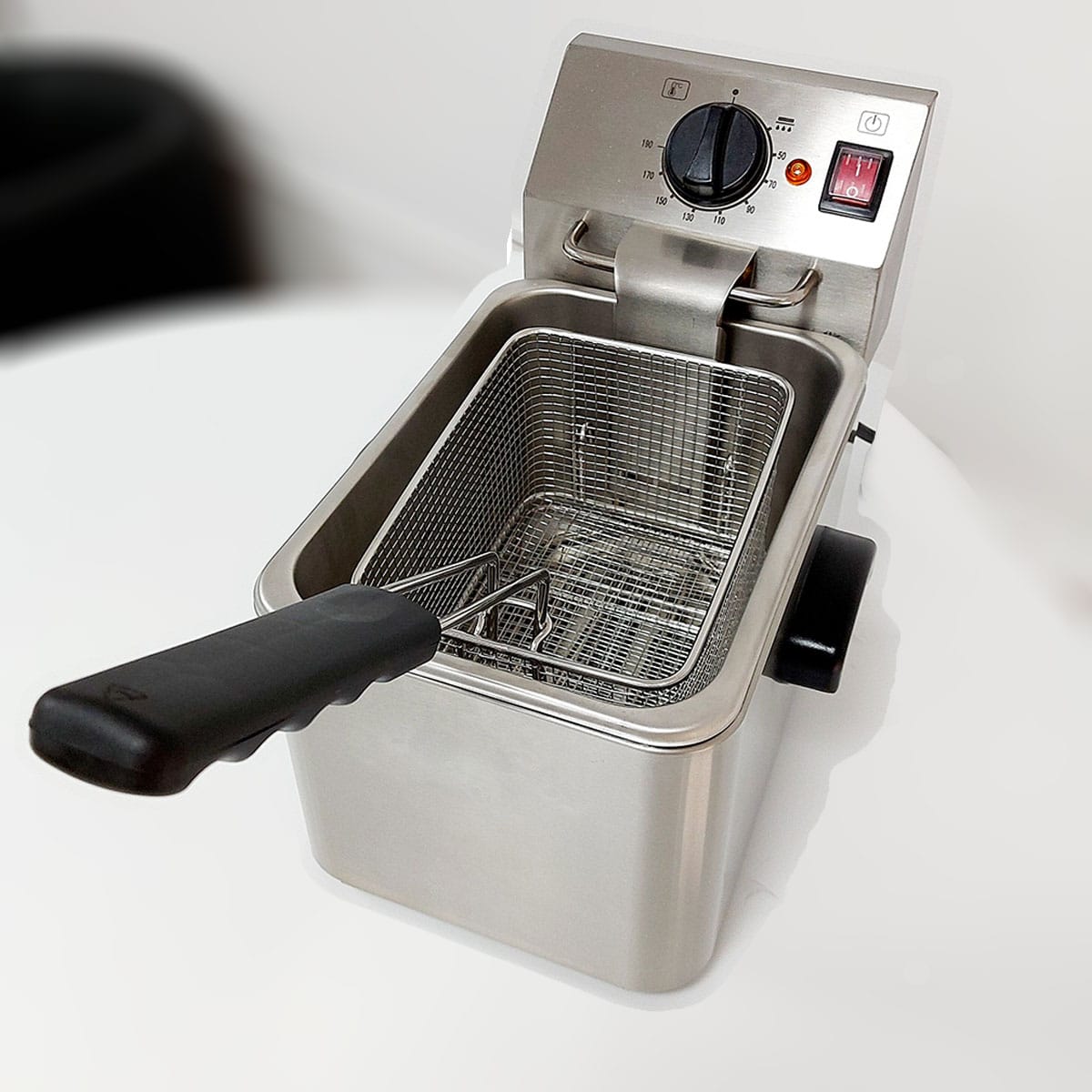 sem ângulos e com marcações de nível de óleo MAX-MIN Cabeça eléctrica amovível para facilitar a limpeza Termostato de trabalho ajustável até 190°C Termostato de segurança com rearme manual 230°C Elemento de aquecimento blindado em aço inoxidável Sistema de fixação do cesto para drenar o óleo na cabeça Cesto reforçado em malha de aço inoxidável e haste Pés antiderrapantes