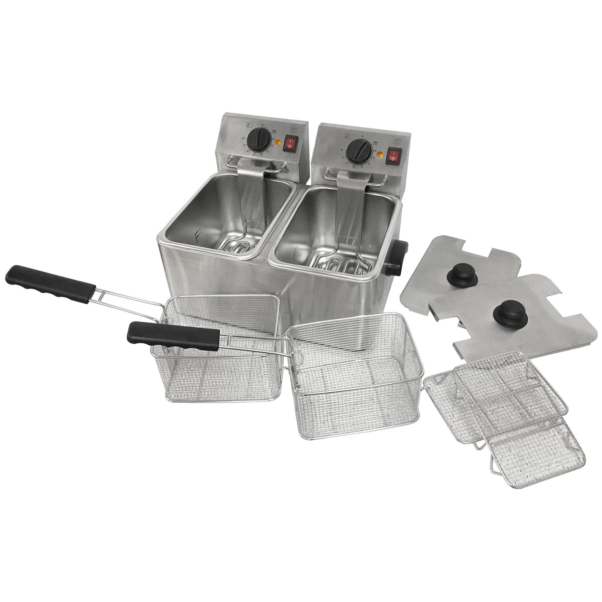 sem ângulos e com marcações de nível de óleo MAX-MIN Cabeça eléctrica amovível para facilitar a limpeza Termostato de trabalho ajustável até 190°C Termostato de segurança com rearme manual 230°C Elemento de aquecimento blindado em aço inoxidável Sistema de fixação do cesto para drenar o óleo na cabeça Cesto reforçado em malha de aço inoxidável e haste Pés antiderrapantes