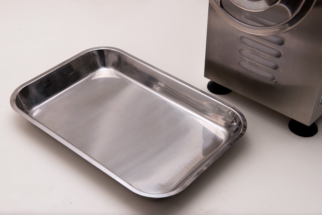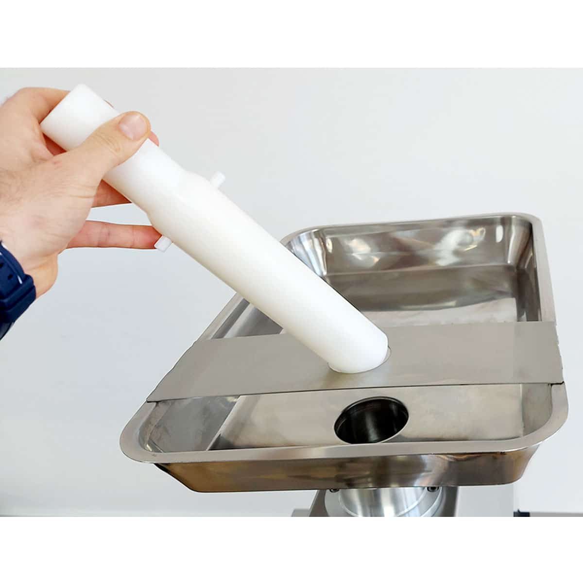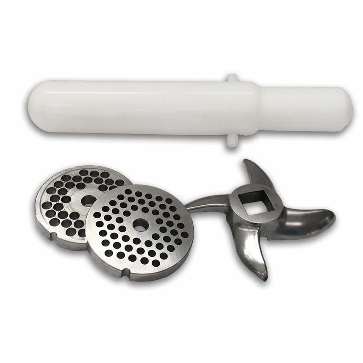 Inclui: 2 lâminas, 2 placas (orifício de 6 e 8 mm), empurrador etabuleiro para recolha de produtos.