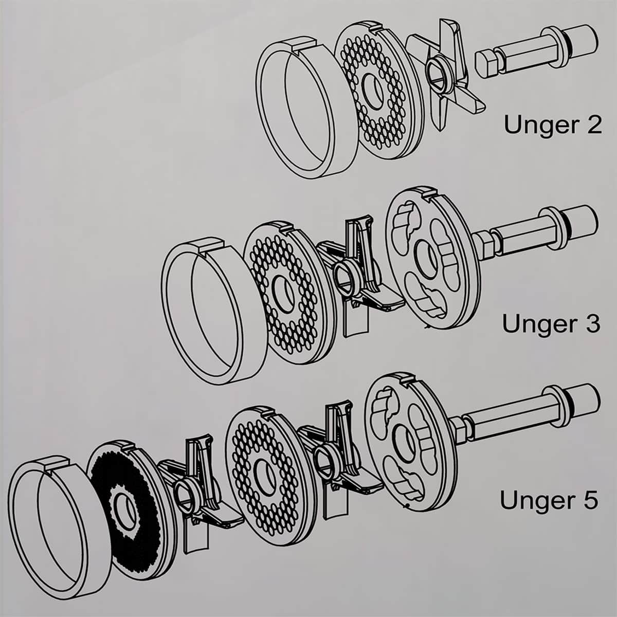 É fornecido um anel de compensação curto para a utilização do sistema de corte duplo Unger-3 (2 discos e 1 lâmina de corte duplo), bem como um anel de compensação longo e uma lâmina de corte simples para a utilização do sistema de corte simples Unger-2 (1 disco e 1 lâmina).