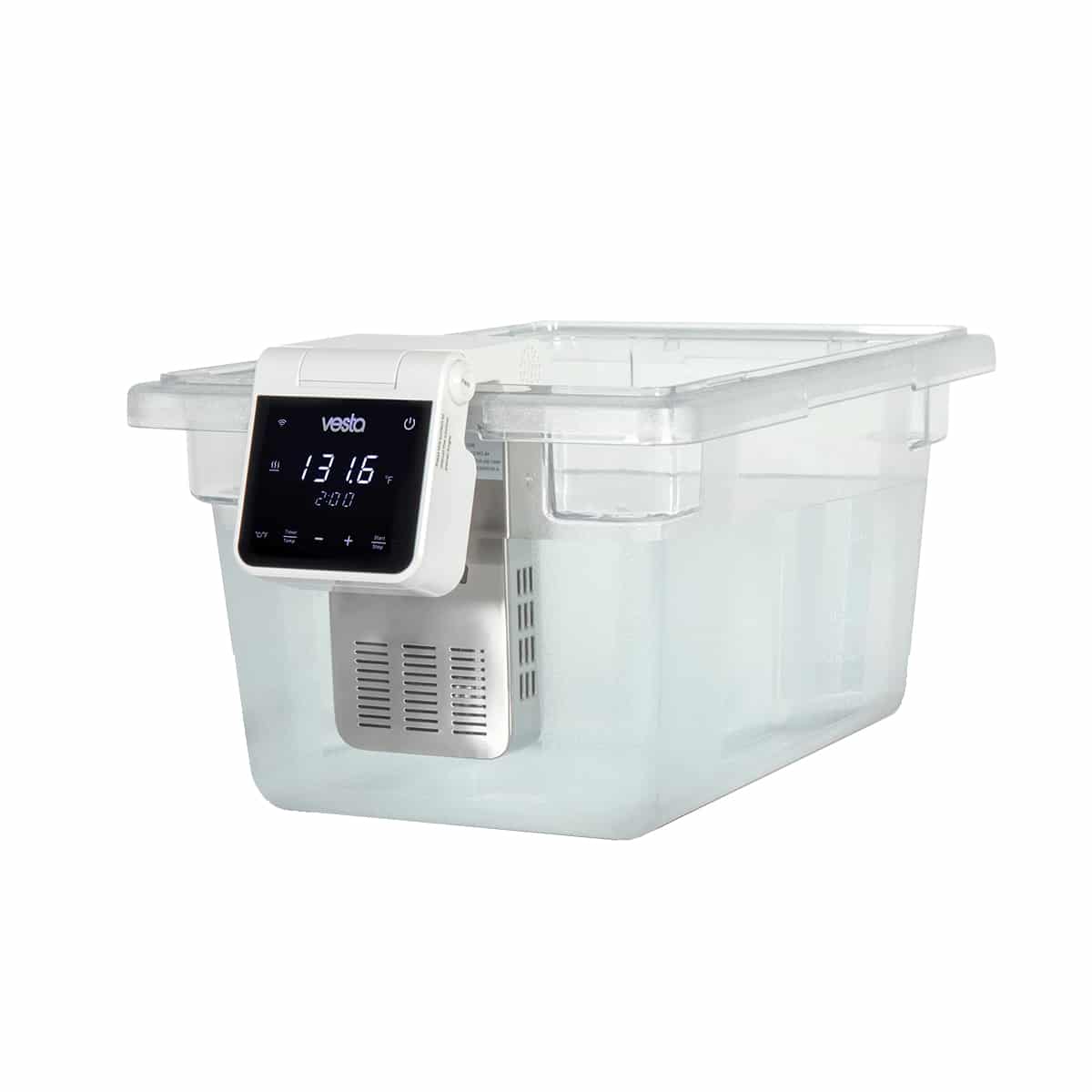 Cozinhar com precisão é mais fácil com o ecrã tátil grande e legível ou controlar a máquina sous vide a partir de qualquer lugar, usando qualquer dispositivo inteligente. Basta descarregar a aplicação Vesta e também podes monitorizar, ajustar e controlar a máquina a partir do teu smartphone.