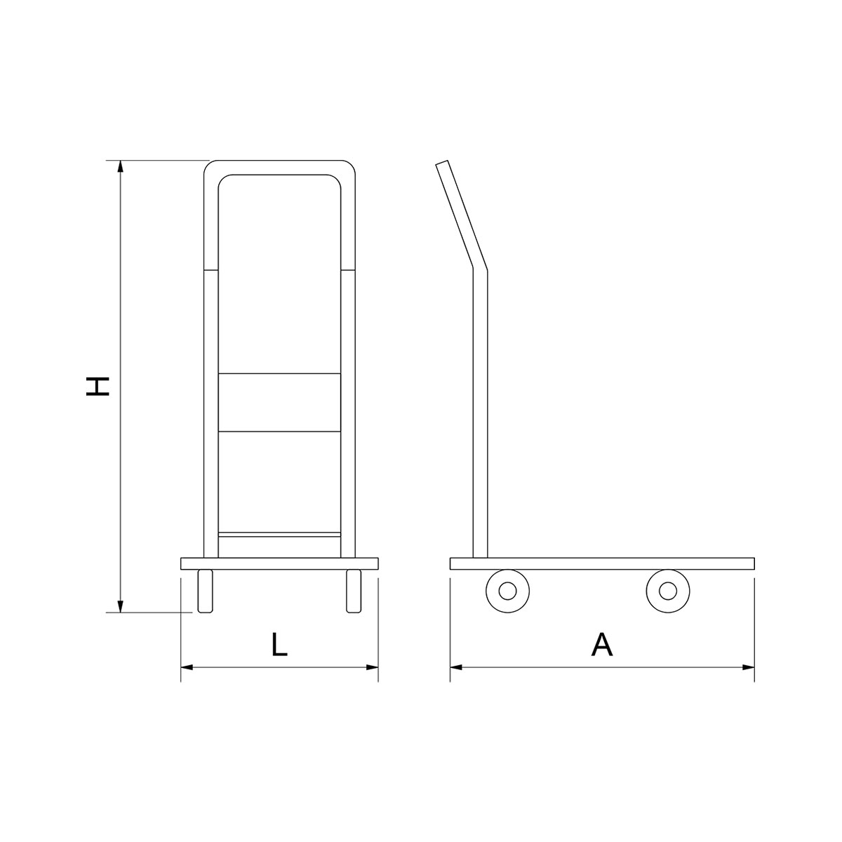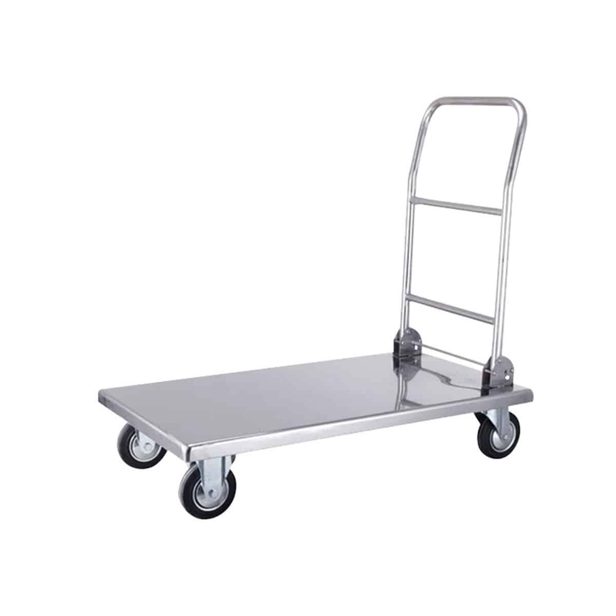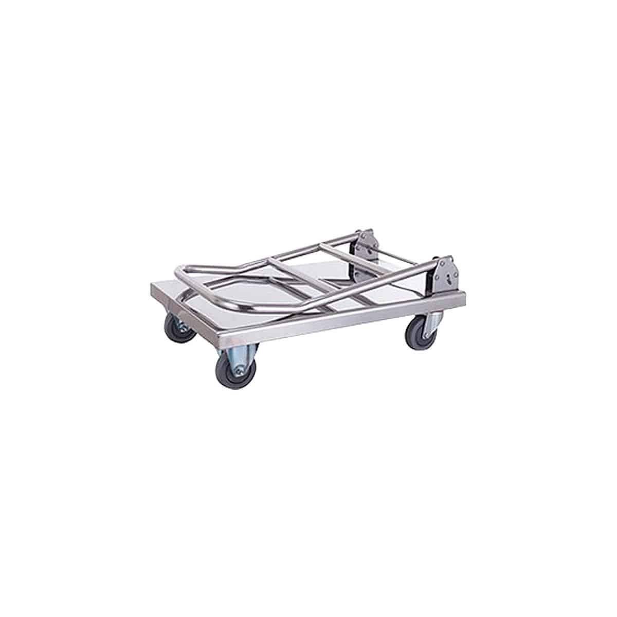 Carrinho plataforma em aço inoxidável para utilização em armazéns. Inclui uma plataforma com uma capacidade de carga até 300 kg e mecanismos de proteção anti-impacto.